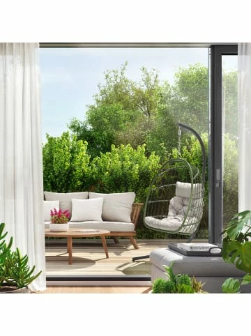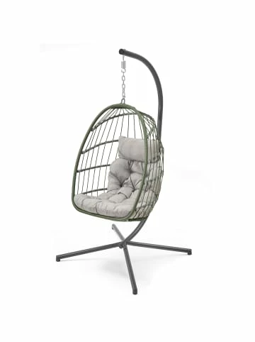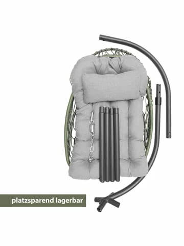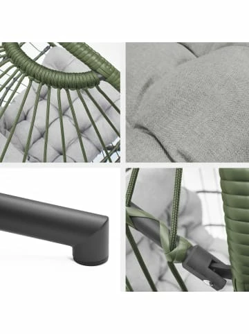 Mit dem Hängesessel können Sie es sich auf Ihrem Balkon gemütlich machen. So können Sie nicht nur faulenzen, sondern auch die Zeit im Freien genießen. Das coole Design und die robusten Materialien sorgen dafür, dass dieses Produkt länger hält als die meisten anderen heute erhältlichen Schaukelstühle. Mit diesem Schaukelstuhl, der nicht nur stilvoll, sondern auch sehr witterungsbeständig ist, können Sie auf Ihrem Balkon oder im Garten abhängen. Er hat eine Größe von 95 x 95 x 196 cm und ist bis zu 136 kg belastbar! Der pulverbeschichtete Rahmen sorgt für eine lange Lebensdauer, so dass er immer da ist, wenn man ihn am meisten braucht – sei es für ein Nickerchen nach der Arbeit oder ein Nickerchen in den Sommerferien.Material Rahmen: pulverbeschichteter stahl (schwarz)Material Korb: Polyrattan (dunkelgrün)Material Kissen: Polyester (anthrazit)Material Aufhängung: Edelstahl (silber) – Entspannen Sie sich bequem auf Ihrem Balkon oder Ihrer Veranda – Rocken Sie stilvoll mit einem einzigartigen und eleganten Design – Wetterfest für den Einsatz im Freien – Dank der verstellbaren Kette können Sie ihn fast überall aufhängen – Robuste Konstruktion trägt bis zu 136 kg
