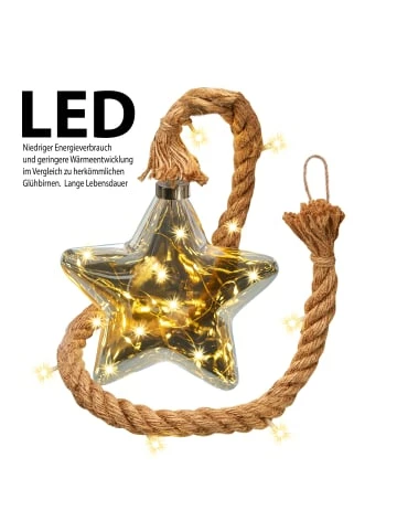 Mit einem AMARE LED-Stern am Seil können Sie zauberhafte dekorative Akzente in Ihrem Zuhause setzen. Die verschiedenen Farbvarianten des 18 cm großen Sterns sorgen für stimmungsvolles Licht und individuelle Looks für jeden Raum. Neben dieser Flexibilität sorgen die batteriebetriebenen Sterne mit ihren aufbereiteten LEDs für einen äußerst geringen Energieverbrauch und lassen sich als wunderschöne Dekoration herabhängen oder in Kränze integrieren – sie sind perfekt, egal wie viel Platz dort ist, wo sie hinsollen. – Tolle Draht-LED-Lichter in einem besonderen Glasstern an einem Naturseil – Wir bieten die LED-Sterne am Seil als Farbvariante mit Eisglas, Rauchglas, Bernsteinglas an – Mit 6h-Timer zur optimalen Steuerung der Beleuchtungszeit – Mit den batteriebetriebenen LED-Sternen können Sie jede Dekoration kreieren, die Ihr Herz begehrt. Ob als Adventskranz hängend oder über einem Weihnachtstisch platziert. – Wird mit 2xAA Batterien betrieben ( diese sind nicht enthalten )