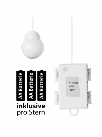 Mit unserer neuen LED-Sternenkette geht die Party erst richtig los!Hängen Sie diese wunderschöne, leuchtende Weihnachtsdekoration auf und machen Sie Ihr Zuhause fit für die Feiertage. Sie wird mit 6 AA-Batterien geliefert und verfügt über einen Ein-/Ausschalter, mit dem Sie einstellen können, dass sie sich jeden Tag zu einer bestimmten Zeit automatisch einschaltet. Dies ist die perfekte Ergänzung für jeden Weihnachtsbaum! – Weißes IP44 Batteriefach inkl. 6 x 1,5 V Batterien LR6 AA – Für den Innen- und Außengebrauch geeignet – Durchmesser der Sterne 27 cm – Transparentes Zuleitungskabel 1 m lang – 6-Stunden-Timer-Funktion