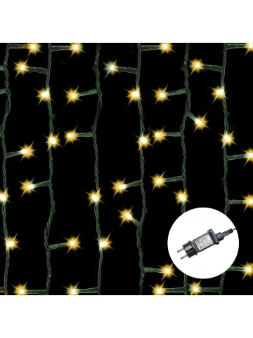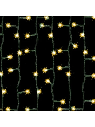 Die Galaxie-Lichterkette bietet LED-Beleuchtung in der Farbe Warmweiß und jetzt auch in einem Bernsteinton. Das Produkt kann sowohl im Innen- als auch im Außenbereich eingesetzt werden. Der Strang ist 19,90 m lang und dunkelgrün die Kabelfarbe, hinzu kommt noch eine 10 m lange Zuleitung. Die LEDs sitzen in einem Abstand von 10 cm auf der Kette. Die Leistung der LEDs liegt bei je 3 V / 0,06 W, was zu einer Gesamtleistung der Lichterkette von 30 V DC / 3,6 W führt. – 200er LED Lichterkette inkl. IP44 Außentransformator – dunkelgrünes Kabel – 20 m Lichterstrang mit 10 m Zuleitung – 6-Stunden-Timer-Funktion – 8 Modifunktionen