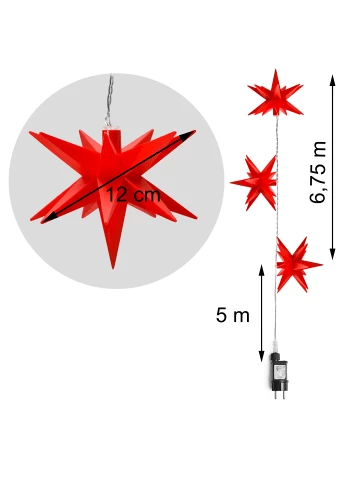 Die Kette ist 6,75 m lang und verfügt über eine 5,0 m lange Zuleitung und einen IP44-geschützten Außentransformator. Sie kann innen und außen betrieben werden. Zur Kette gehören 10 Sterne mit einem Durchmesser von je 12 cm sowie mit jeweils 15 Zacken. Die LEDs geben warmweißes Licht ab und leisten je 3 V / 0,06 W. Wer mag, schaltet die Kette im Dauerbetrieb mit einer Zeitschaltuhr zusammen. Ein Timer gehört ebenfalls zur Lichterkette. – Für den Innen- und Außengebrauch geeignet – 6 h Timer- Funktion oder Dauerbetrieb – 10 Sterne je 12 cm bei 6,75 m Länge – Anzahl der Zacken je Stern: 15 – 5 m Zuleitung transparent – Kompatibel mit Zeitschaltuhren