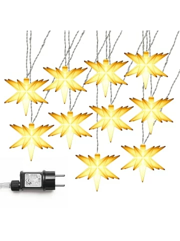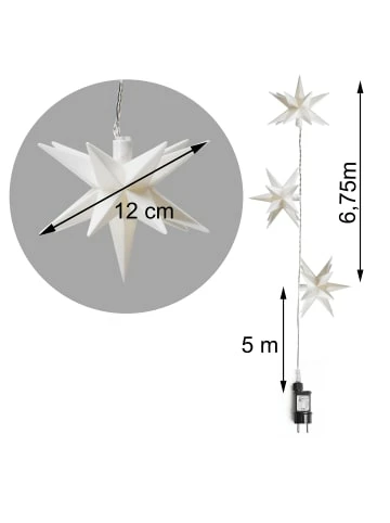 Die Kette ist 6,75 m lang und verfügt über eine 5,0 m lange Zuleitung und einen IP44-geschützten Außentransformator. Sie kann innen und außen betrieben werden. Zur Kette gehören 10 Sterne mit einem Durchmesser von je 12 cm sowie mit jeweils 15 Zacken. Die LEDs geben warmweißes Licht ab und leisten je 3 V / 0,06 W. Wer mag, schaltet die Kette im Dauerbetrieb mit einer Zeitschaltuhr zusammen. Ein Timer gehört ebenfalls zur Lichterkette. – Für den Innen- und Außengebrauch geeignet – 6 h Timer- Funktion oder Dauerbetrieb – 10 Sterne je 12 cm bei 6,75 m Länge – Anzahl der Zacken je Stern: 15 – 5 m Zuleitung transparent – Kompatibel mit Zeitschaltuhren