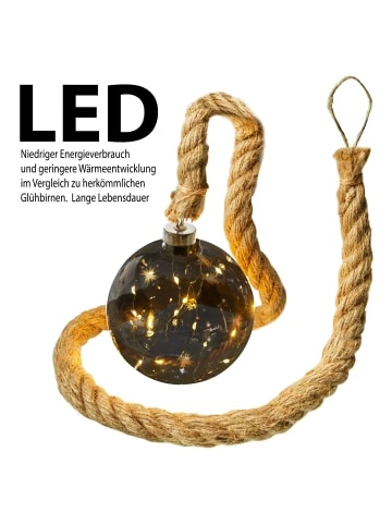 Mit unserer AMARE LED-Kugel am Seil können Sie charmante dekorative Akzente in Ihrem Zuhause setzen! Die verschiedenen Varianten der LED-Leuchte bringen stimmungsvolle Beleuchtung in jeden Raum – vom Weihnachtsbaum bis zum Wohnzimmer. Zudem sorgen die verarbeiteten LEDs für einen extrem niedrigen Energieverbrauch und bieten dennoch schöne Lichteffekte für alle Gelegenheiten und Stimmungen, die man sich im Laufe des Tages wünscht. – Bringen Sie Licht und Atmosphäre in Ihr Zuhause mit schönen Draht-LED-Lichtern in einer Glaskugel – Verschiedene Größen & Farben: wir bieten die LED-Kugeln am Seil in den Durchmessern 10, 12 & 15 cm sowie als Variante mit Milchglas, Rauchglas, Bernsteinglas & Perlmuttglas an. – Vielseitig einsetzbar, z. B. an einem Seil hängend, in einen Adventskranz integriert oder einfach auf einem Weihnachtstisch platziert – Zeitgesteuerte Funktion, damit Sie die Beleuchtungszeit kontrollieren können – Äußerst geringer Stromverbrauch und batteriebetrieben